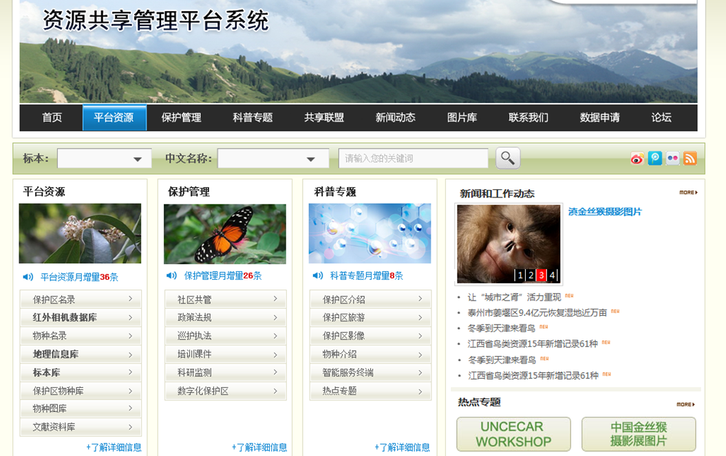 该系统支持在 Windows 和 Linux 两种操作系统下部署,需安装 JDK、Tomcat 环境,兼容 SQL Server、MySQL、Oracle 等多种数据库,部署过程中可通过配置文件修改数据库连接信息、端口号等关键参数,确保系统稳定运行。系统核心功能围绕资源信息展示平台展开,首页整合平台资源、保护管理、科普专题、共享联盟、新闻动态、数据申请、论坛等核心模块,为用户提供一站式资源访问入口。