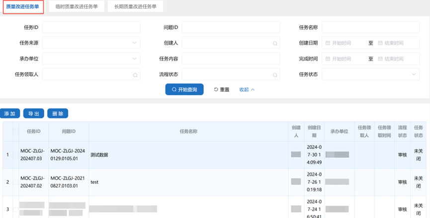 所有用户可通过系统查询质量改进任务单信息,按任务 ID、问题 ID、任务名称、创建日期、承办单位等条件组合查询,查看任务详细信息及流程流转状态,系统支持任务单数据导出与删除操作(仅状态为 “编制培训计划” 的项可删除),全程图形化展示流程跟踪,清晰呈现各环节办理情况。